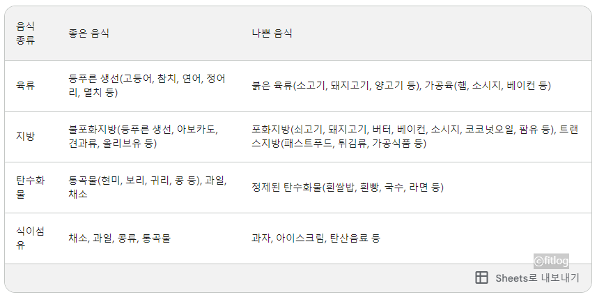 - 과일: 식이섬유가 풍부하여 콜레스테롤 흡수를 억제하고, 비타민과 미네랄이 풍부하여 건강을 유지하는 데 도움이 됩니다.
