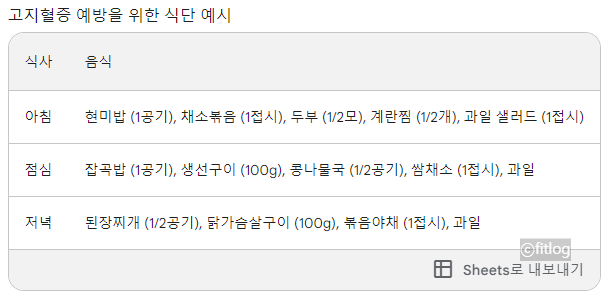 - 위의 식단은 고지혈증 예방을 위한 가이드라인입니다. 개인의 체질과 상황에 따라 조절할 수 있습니다.