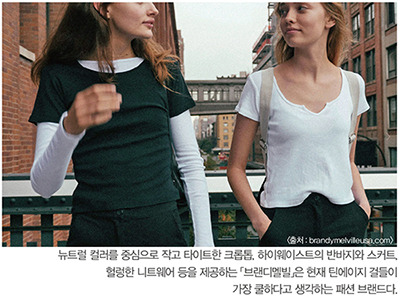 브랜디멜빌은 편안하면서도 스타일리시한 의상을 제공합니다. 기본 티셔츠, 후드티, 원피스 등 다양한 아이템이 있으며, 특히 여름철에는 크롭탑과 데님 쇼츠가 인기를 끌고 있습니다.